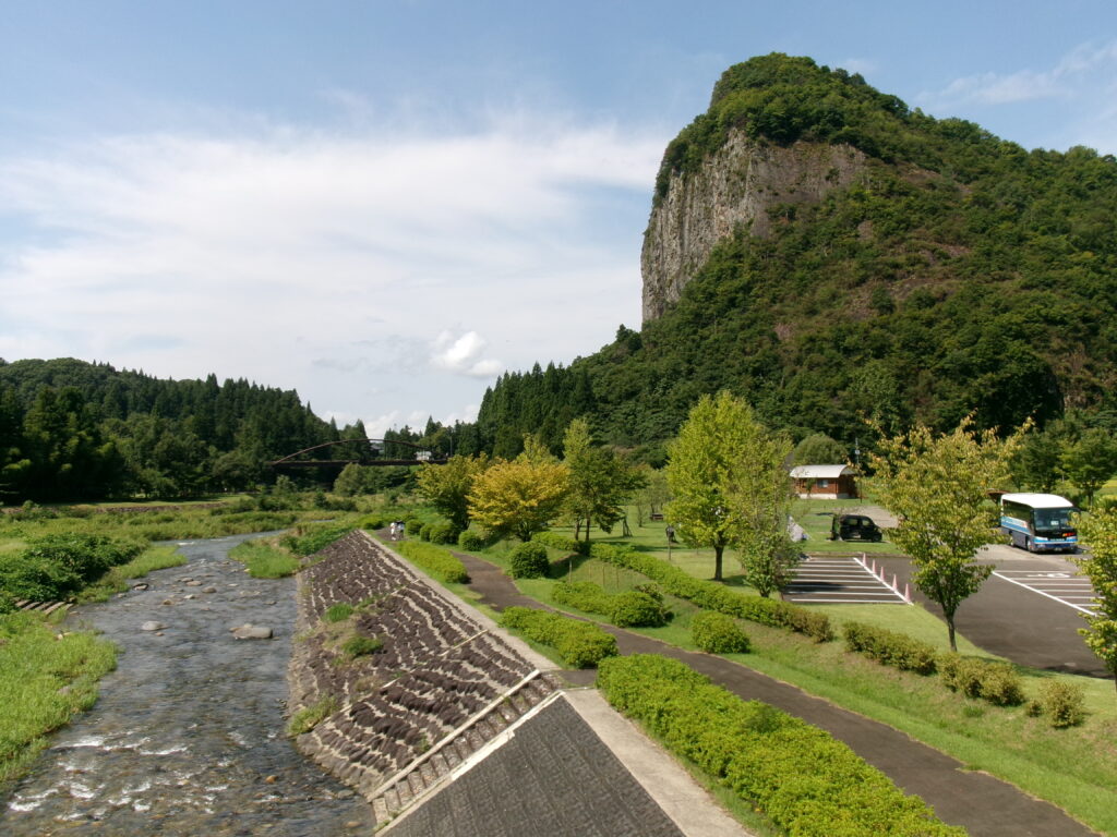 2005年に三条市と合併する前は南蒲原郡下田村と言われ、そこにそそりたつ岩壁の『八木が鼻(やぎがはな)』は猛禽類の『はやぶさ』の生息地として知られています。高さ200m以上の石英粗面岩(セキエイソメンガン)の下には一級河川・五十嵐川(いがらしがわ)が流れ、八木が鼻に向かってくる道中では美しい渓谷を見せてくれます。また、オートキャンプ場もあるのでテントを張っている家族もいたようですね。