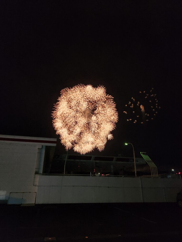 そして、お客さまにはご理解をいただいて、今年も、四尺玉の花火はバスの駐車場から見ていただきました。迫力を伝えることが出来ないと思いますが、向かって右側の写真が「昇天銀竜黄金千輪二段咲き」の四尺玉の花火です。上空800mまで上がり、800mの大輪が開きます。江戸川区にお住いの皆さまにはスカイツリーが634mですから、スカイツリーもすっぽり入るという世界最大級の花火です。感動冷めやらぬ中、バスにご乗車いただいて22時20分に駐車場を出発しました。と、ここまではご参加いただいた皆さまのおかげで順調だったのですが、高速道路のICまでがどこをどう走っても既に渋滞の嵐となっていました。