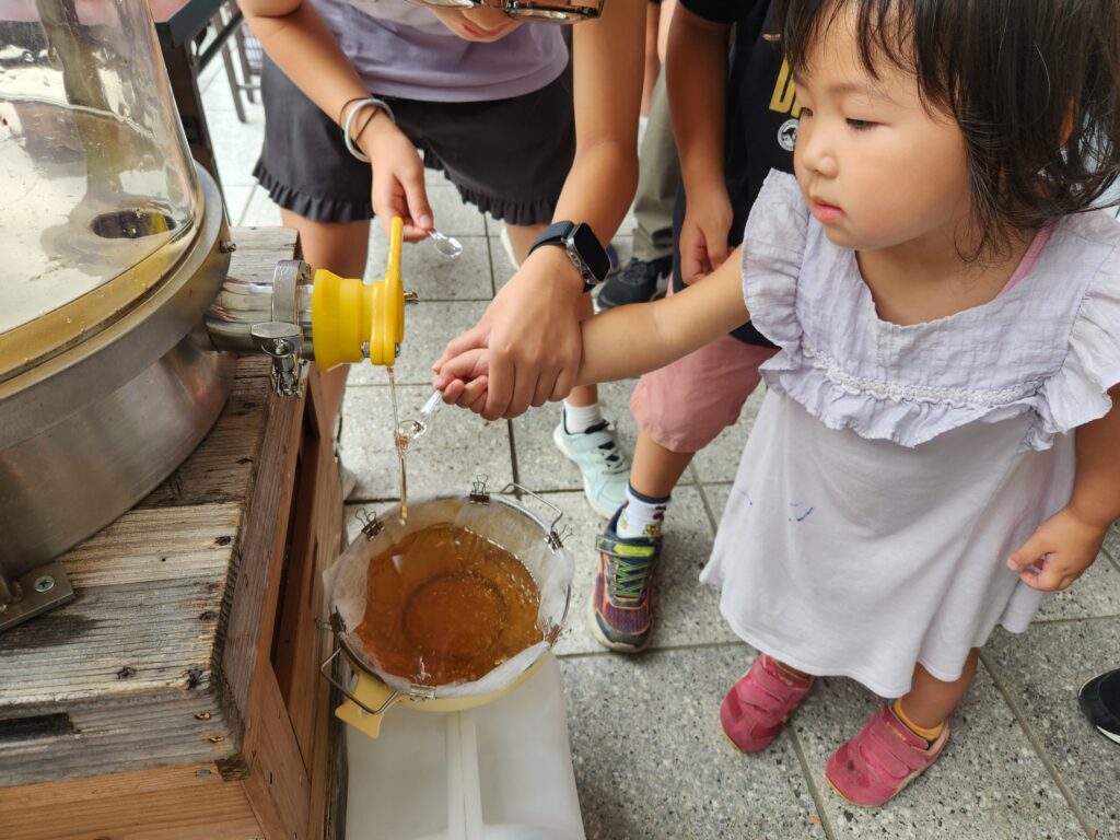 女王蜂の生態やミツバチの生活を聞いて初めて知ることも多かったことでしょう。働きバチは全てメスでオスは巣箱でまったり過ごしているんだとか。働きバチが一生懸命集めた蜜は濃厚でコクがあって、最高です。お子様から大人の方まで興味津々に体験を楽しんでいらっしゃいましたっけ。