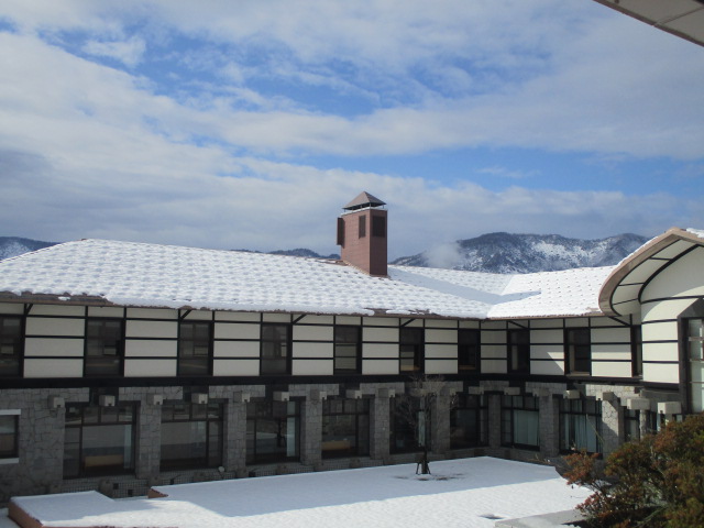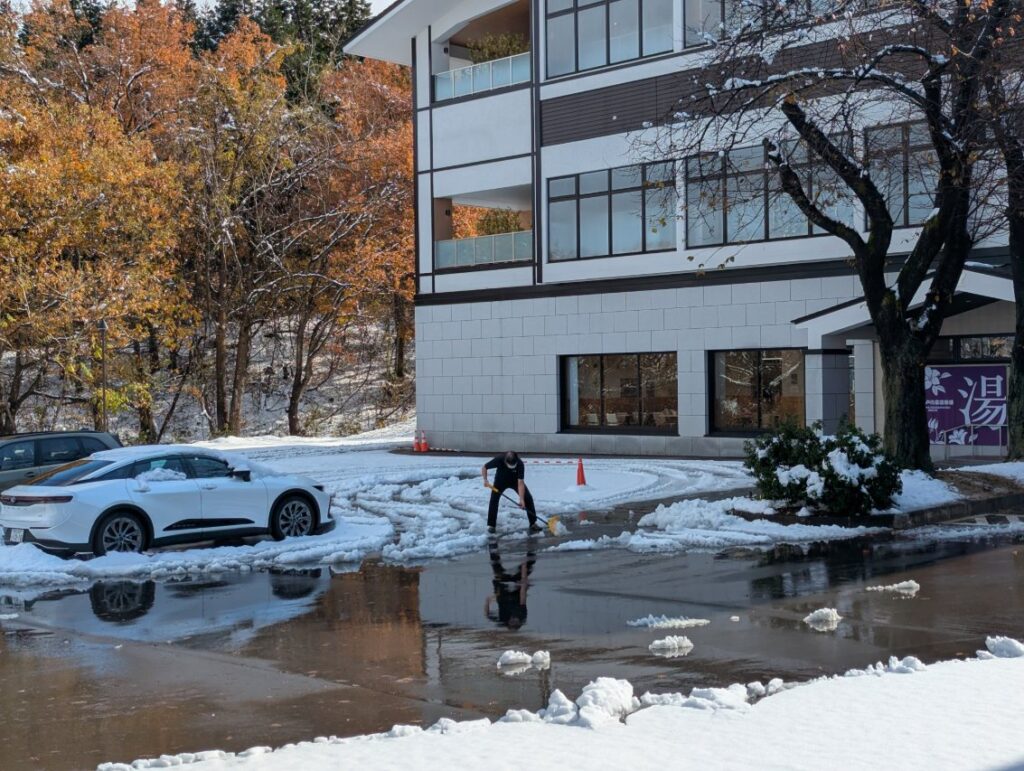 年に一度しかない初雪です(笑)。18日の夕方から一晩降り続き、朝にはすっかり雪化粧。駐車場でスタッフが黙々と雪かきをしております。