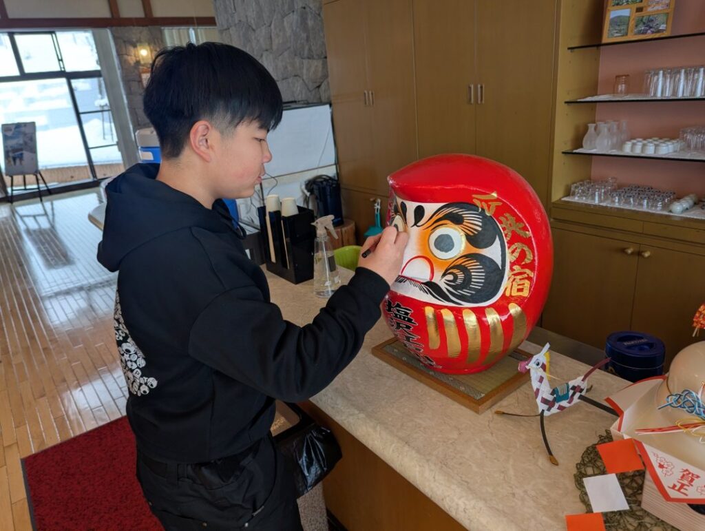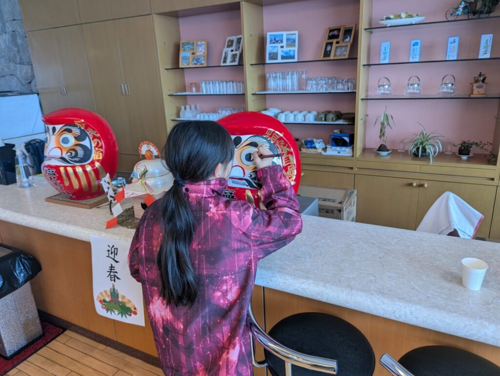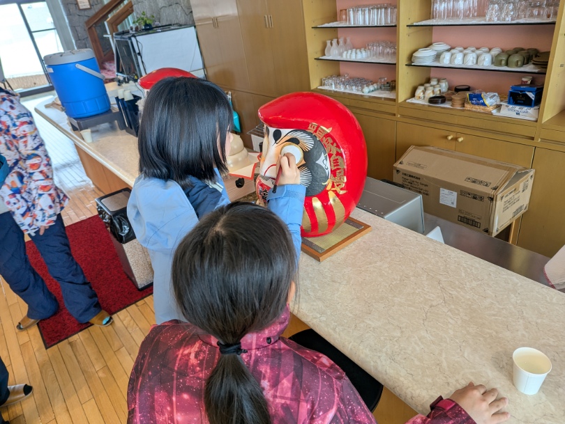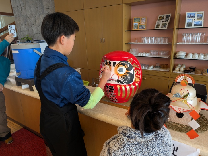 毎年、群馬県高崎市ご在住のお客様のご好意で『高崎だるま』を頂いておりまして、年末年始にご宿泊の子どもたちに思いを込めて『目』を入れて頂いています。