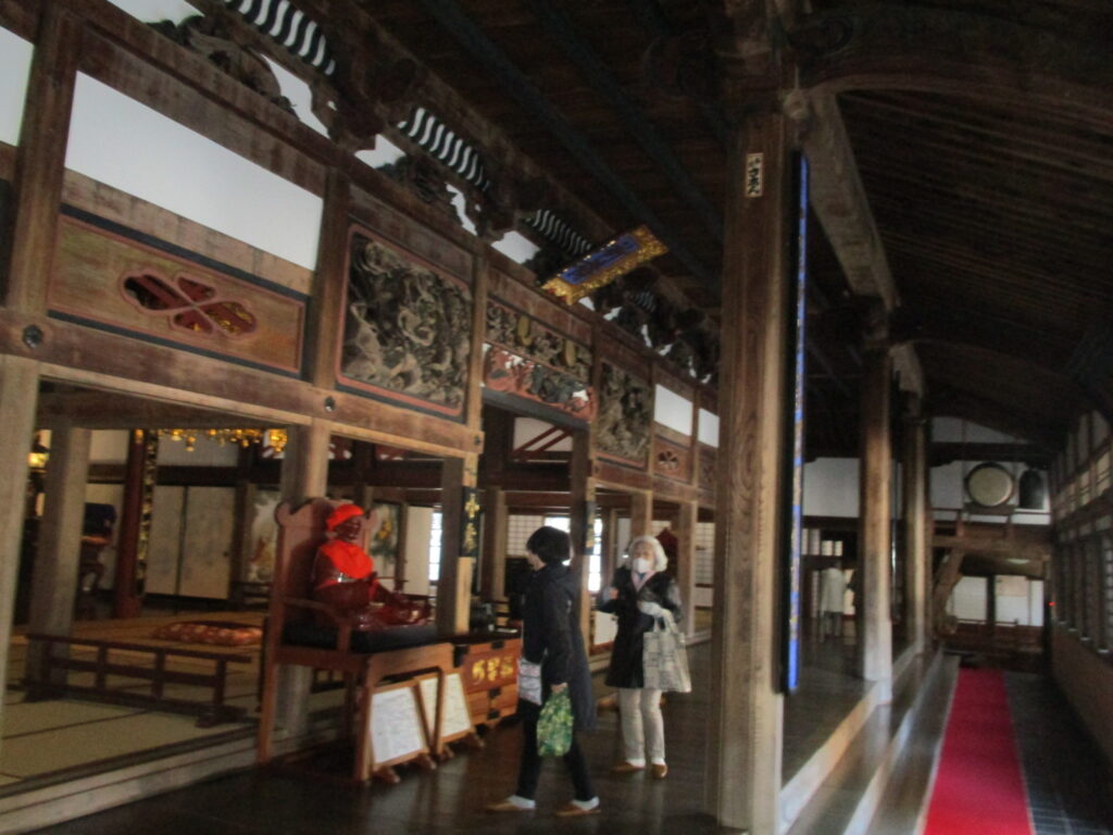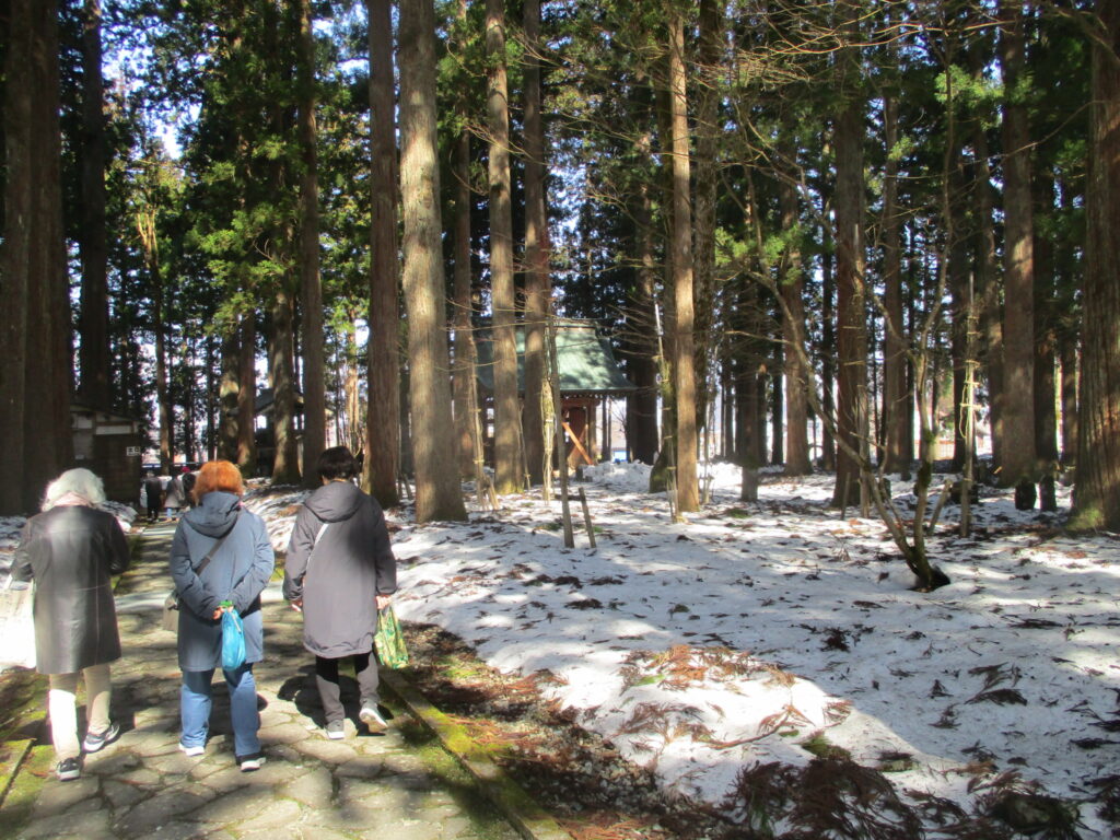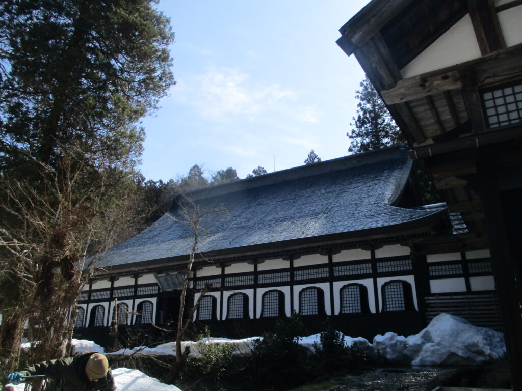 ウィンタースクールも滞りなく終了して、ついに塩沢号再開の時がやってまいりました。比較的お天気には恵まれたものの肌寒さを感じる中、南魚沼の古刹「雲洞庵」にご案内。辺りには雪が残り・・・とは言っても例年よりはとても少ないのではありますが、参拝前にお電話したところ、係の方が「本堂の中は外よりも寒いですよ。」と教えてくださり、お客様には暖かくしてお出かけいただきました。普段なら赤門から参道を進むのですが、冬季期間は雪のため、閉鎖となります。現在は改修工事のため令和9年まで通行が出来なくなっています。かつては皇室、大名などの身分の高い人の来訪時にしか使われなかった開かずの門。唯一の例外が年に1度行われる「大般若会」でした。今は、誰でも、この赤門をくぐることが出来ます。(今回は残念でした。)