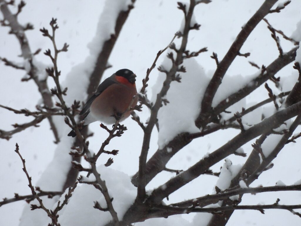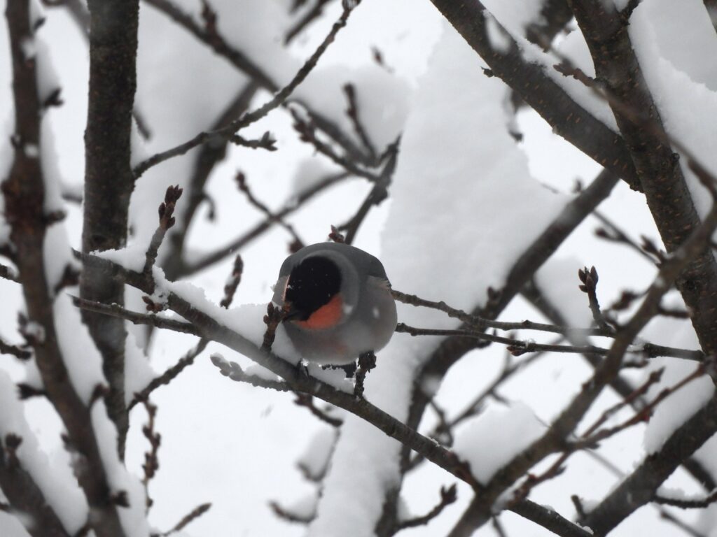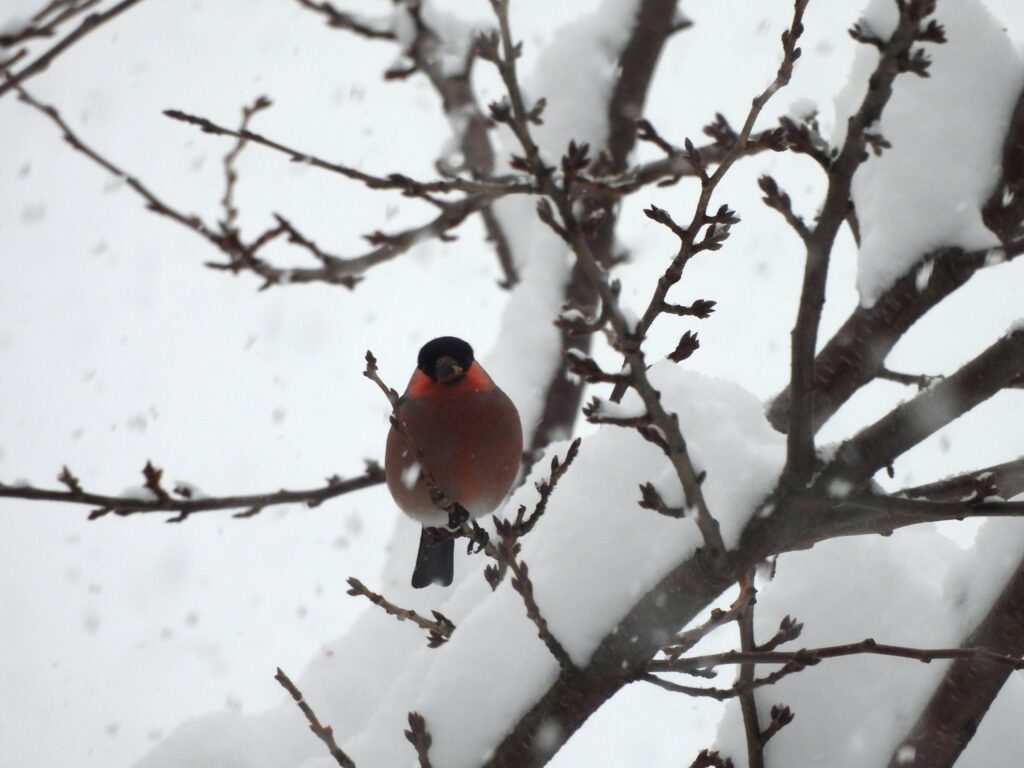 まだ1月の深々と雪が降る中、群れをなして塩沢江戸川荘の桜の木に留まっていたのは野鳥の『ウソ』です。