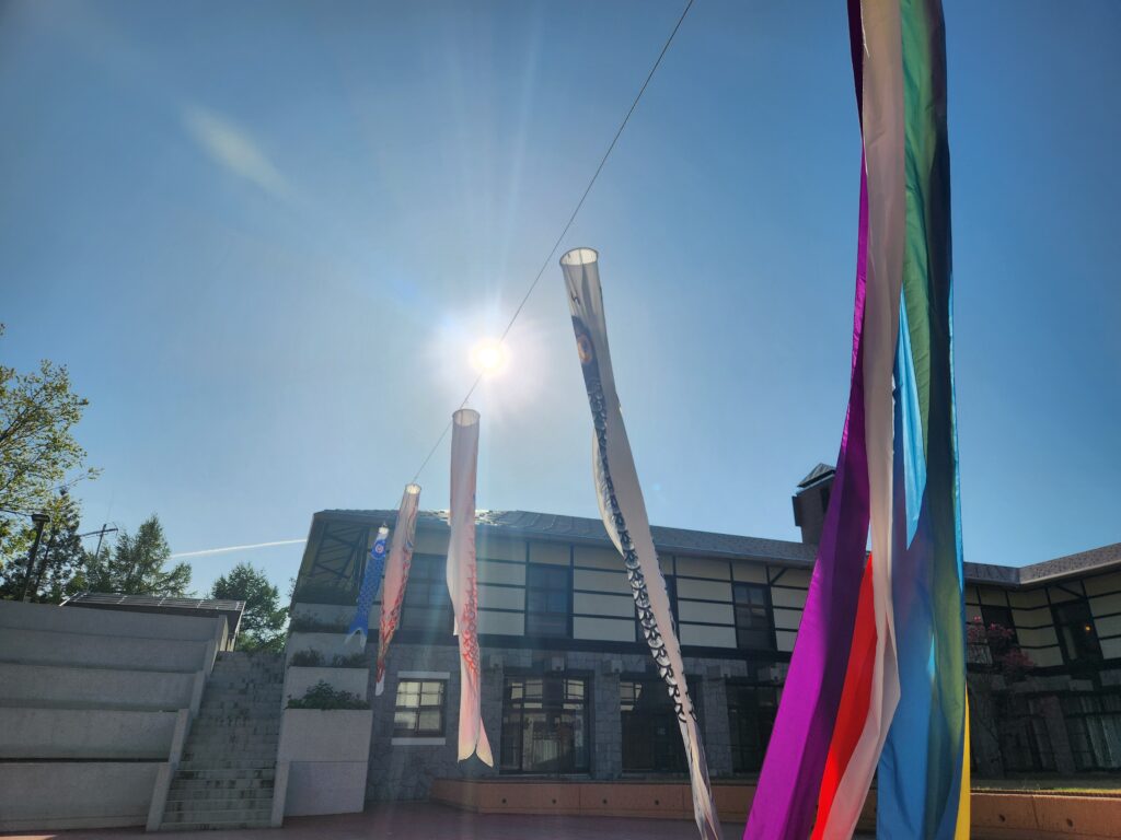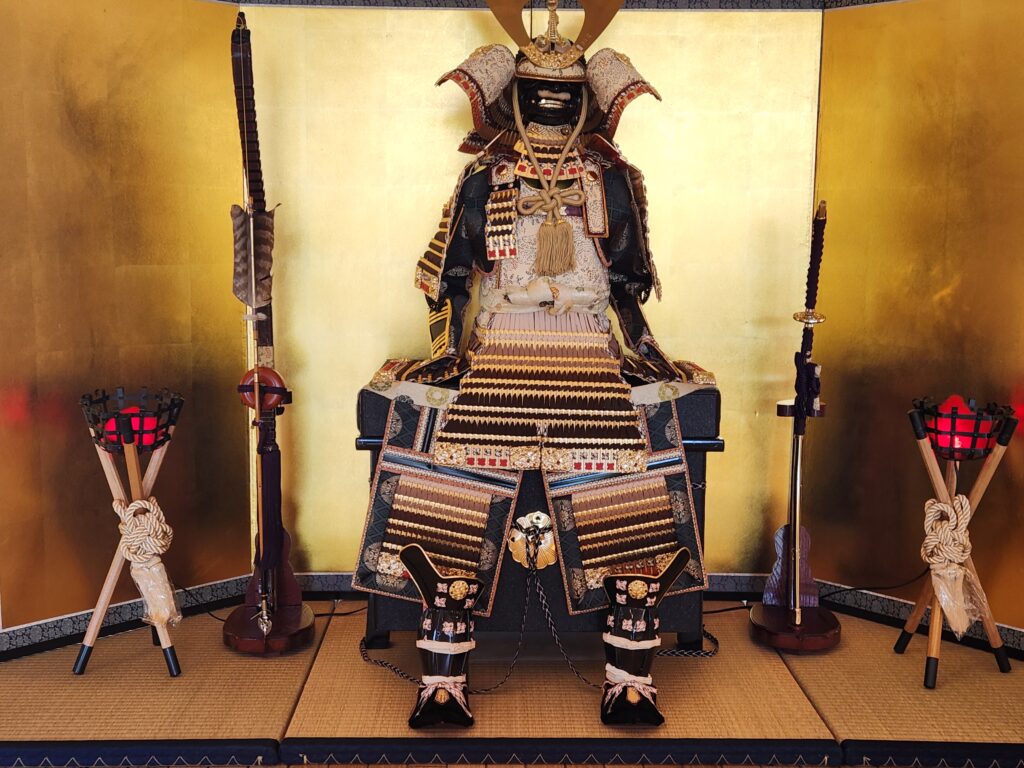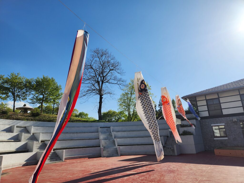当荘のゴールデンウィークの風物詩と言えば、敷地内のまぶしい位の「新緑」と、大きな大きな「こいのぼり」と「五月人形」。こちらは埼玉県岩槻市在住のお客様が人形店を閉店するという時に、寄贈いただいたものです。中庭で気持ちよさそうに泳ぐこいのぼり。ずっとお店を入ると飾られていたという五月人形。良かったら、記念写真を撮って行ってくださいね。
