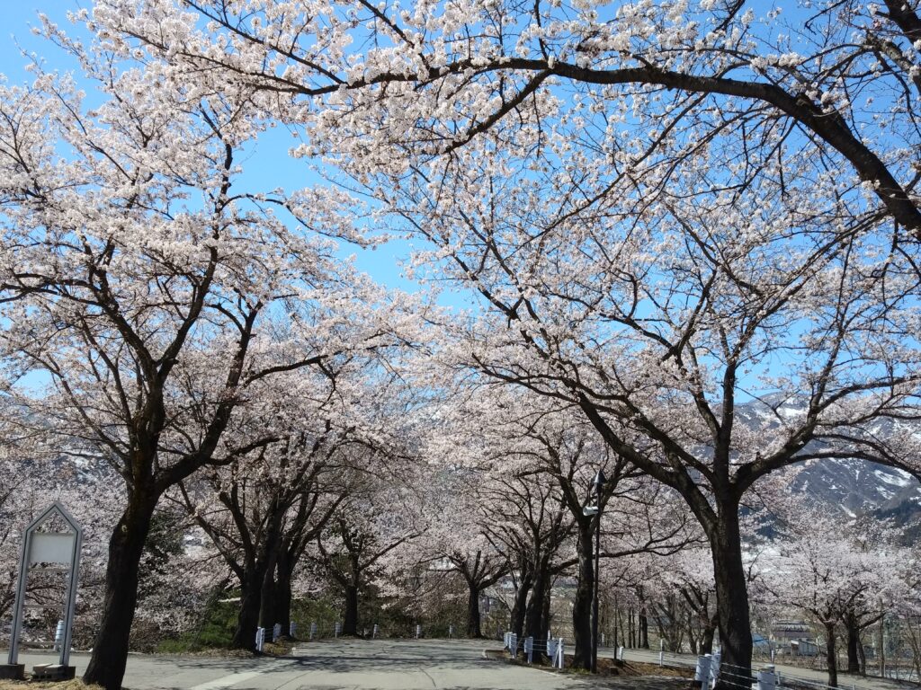 当荘までの坂道もソメイヨシノの並木が続きます。冬にしか来たことのないお客様にはこの木が桜の木だということをご存じない方も多いのですが、辺りの山々の残雪とピンクの桜のコントラストはため息が出るほどきれいな風景です。