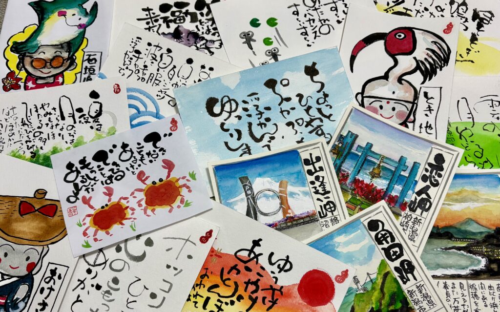 味のある文字と絵。それが「己書」です。書くと楽しい、楽しいから描く。楽しいと嫌なことを忘れる。嫌なことを忘れると笑顔が生まれる。笑顔だとみんな楽しい。そんな幸せの循環が生まれるのが己書です。作品を眺めながらホッと心が緩む時間をお過ごしください。